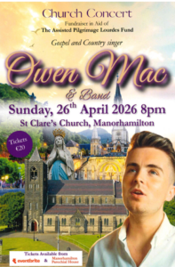 Gospel and Country Singer, Owen Mac and Band, will perform a Concert in St Clare’s Church, Manorhamilton on Sunday 26 April 2026 at 8pm. The Concert is to raise funds for the Assisted Pilgrims who will be going to Lourdes on May 5th this year. Please support if you can. Tickets are €20 each and are available from the Parochial House Manorhamilton or through Eventbrite.