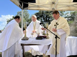 Blessed with good weather, a large congregation travelled out to St Maedhóg’s Island on Port Lake in the parish of Corlough-Templeport on Bank Holiday Monday, 4 August last, when Bishop Martin Hayes celebrated a special Jubilee Year of Hope Mass during which graves on the Island were also blessed. A number of people travelled long distances to attend.