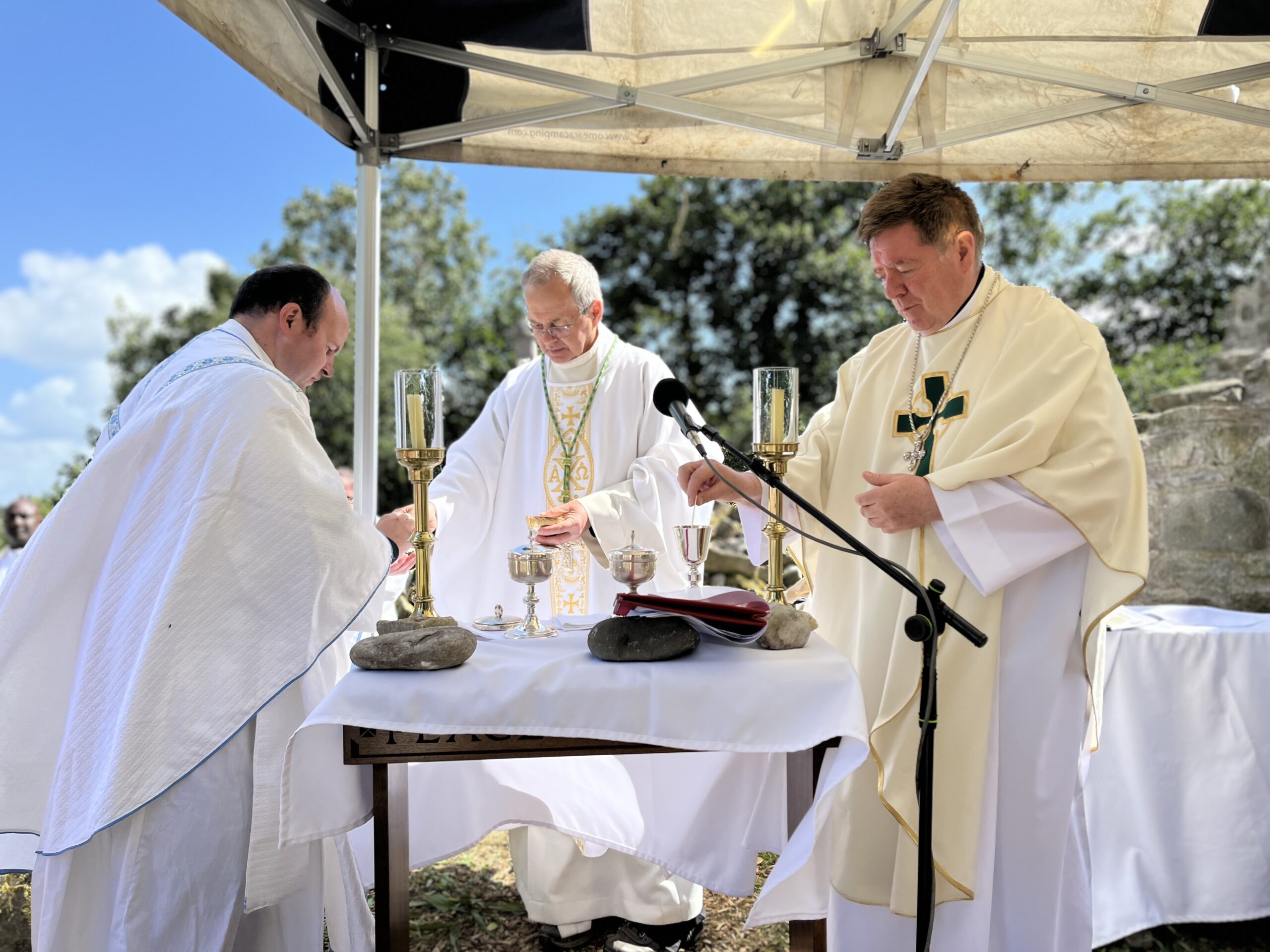 Bishop Martin Hayes and Fr Seán Maguire at the altar in the shadow of the old monastery church